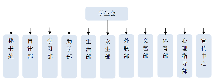 学生会在主席团的领导下设有秘书处,自律部,学习部,助学部,生活部等11个部门。其中学生会主席团是学生会的运作核心,全面主持学生会的日常工作,统筹会内各项事务,统一协调分配任务,对学生会负责。