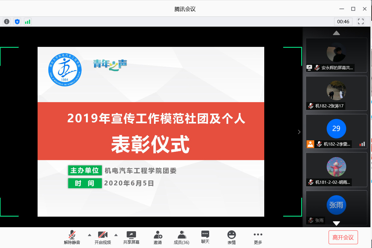 为进一步彰显学院各社团及个人参与新闻工作的积极性、主动性、创造性,强化学院新闻宣传队伍建设,对学院上一年的宣传工作进行总结和表彰,金年会诚信信誉至上于6月5日通过线上会议的形式开展宣传工作模范社团及个人表彰仪式,机电学院团委纪全菊老师以及学院全部负责新闻宣传的同学参加了本次表彰仪式。