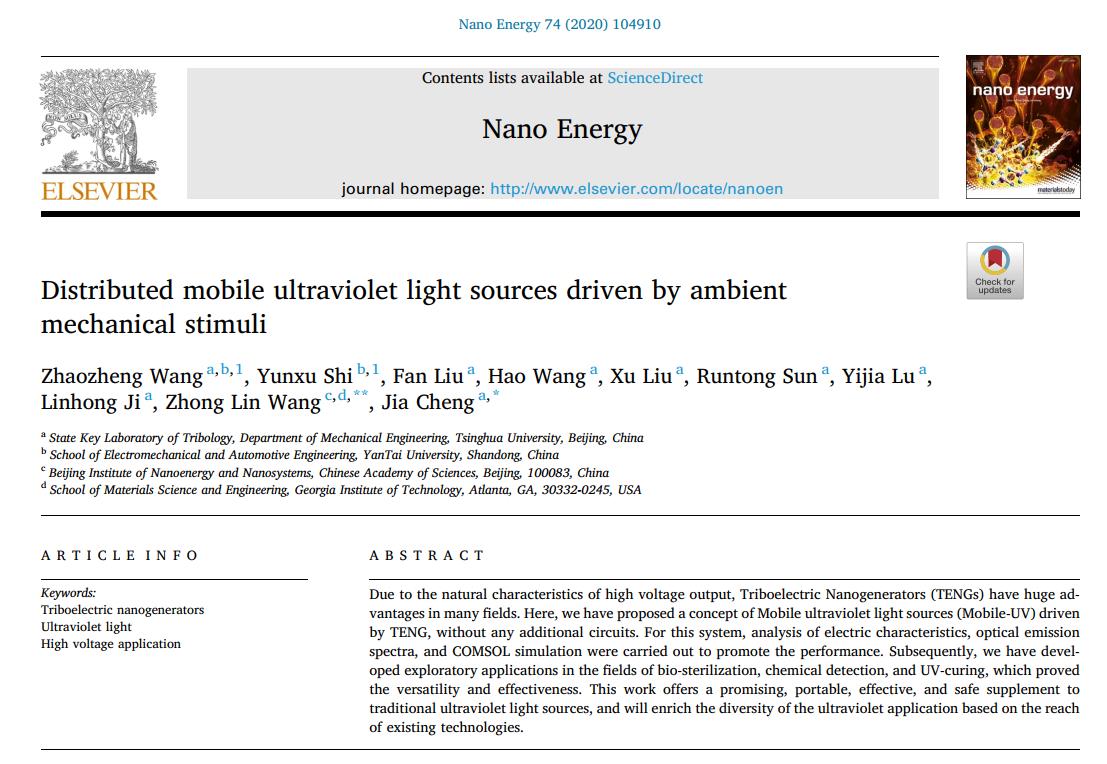 2020年5月4日,我院石运序副教授课题组与清华大学季林红教授课题组合作在国际能源顶级期刊Nano Energy(IF=15.548,JCR一区,TOP期刊)上在线发表题为“Distributed mobile ultraviolet light sources driven by ambient mechanical stimuli”的论文,我院硕士生王昭政和石运序副教授为论文第一作者,清华大学机械系程嘉副研究员和中国科学院外籍院士、佐治亚理工学院终身教授王中林院士为论文通讯作者。