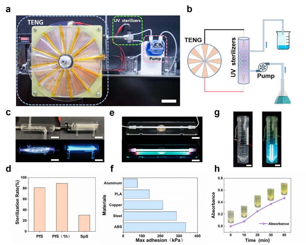 图2. 分布式移动紫外光源在生物杀菌、化学检测和紫外线固化中的应用.(a)水杀菌系统(b)水杀菌流程图(c)水杀菌反应器(d)水杀菌结果(e)光固化反应装置(f)光固化结果(g)光化学反应装置(h)光化学反应结果