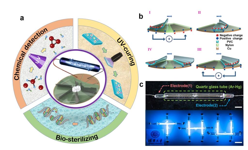 图1. 环境机械刺激驱动的分布式移动紫外光源(a)分布式移动紫外光源概念图 (b)摩擦纳米发电机工作原理图 (c)紫外线发生器实物及图案化